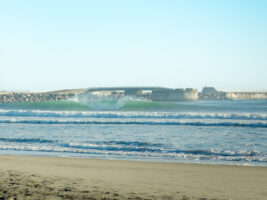原町火力発電所の南側に続く北泉海岸は、防波堤の影響から大きな波が発生。太平洋からの幅広いうねりを拾う遠浅のビーチには、風が合えばライト、レフト共に乗りやすい波がきれいに割れてきます。
