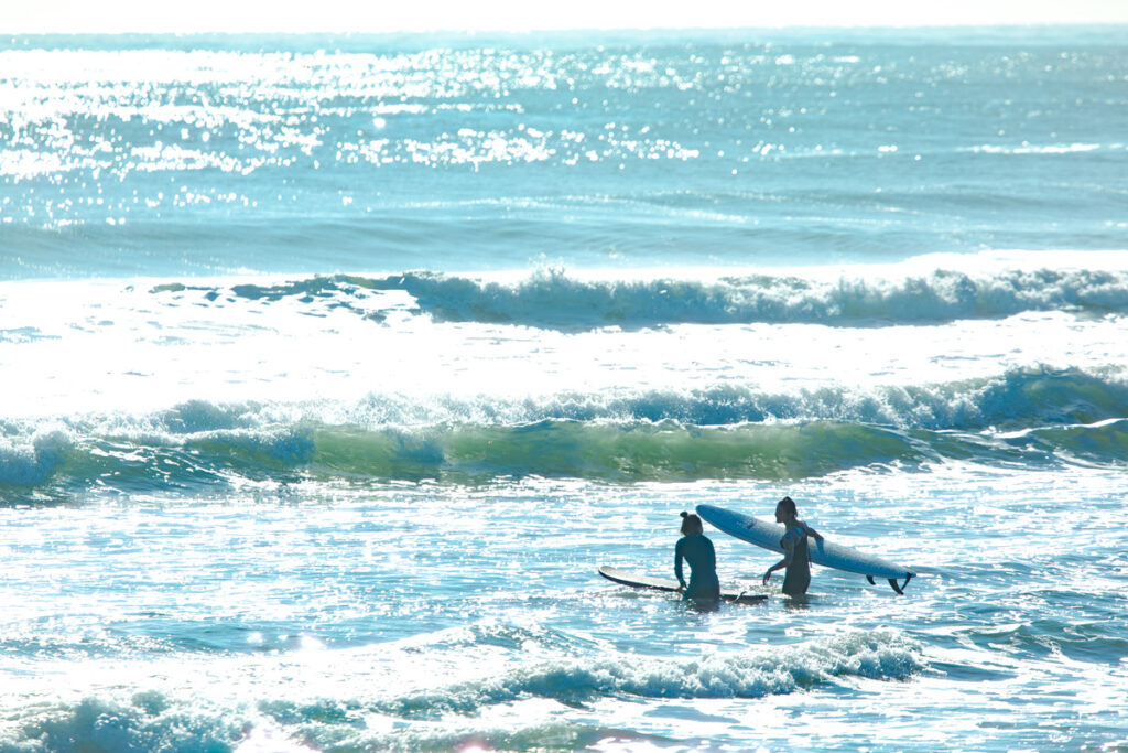 「北泉は東から南方面のうねりを拾いますが、北うねりが回り込んで入ってくるときもあります」と佐藤プロ。「ただしビーチブレイクなので、海が荒れると地形も変化します。年間を通しての特徴は、春は南岸低気圧が入れば頭ぐらいの波がブレイク。この時期は南風が多くて、面が悪くなりがちですが、気候や波の大きさを考えると、初心者も楽しみやすいシーズン。夏は朝晩が無風になることが多く、伊豆諸島周辺に台風ができると、波が反応し始め、遊べます。夏はライフセーバーもいるので、安心してサーフィンを楽しめます」